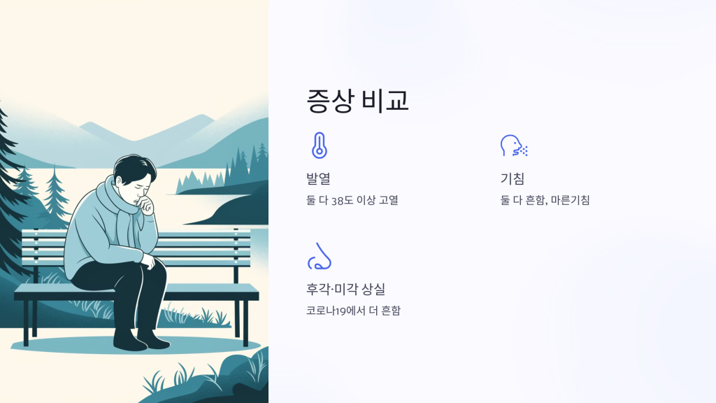 코로나19는 후각·미각 상실이 특징적이며, 독감은 갑작스러운 고열과 근육통이 두드러집니다.