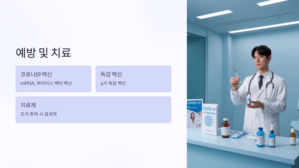 코로나와 독감 모두 백신 접종이 가장 효과적인 예방책이며, 치료제는 조기 투여 시 효과적입니다.